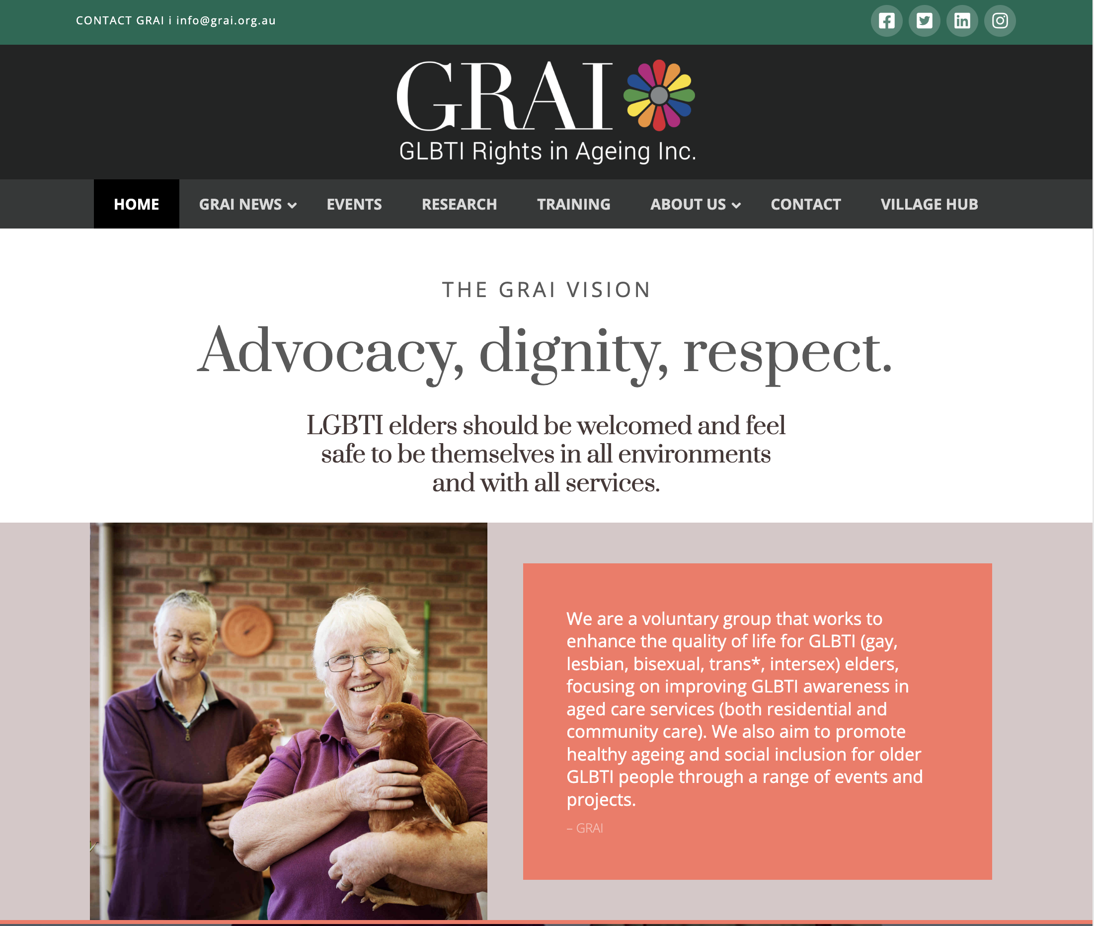 We advocate for LGBTI elders; rights with governments; provide training in the aged care sector, and collaborate with researchers in order to increase the visibility and understanding of, and respect for GLBTI elders. Our work with the community aims to strengthen social connectivity through peer and intergenerational friendships.
